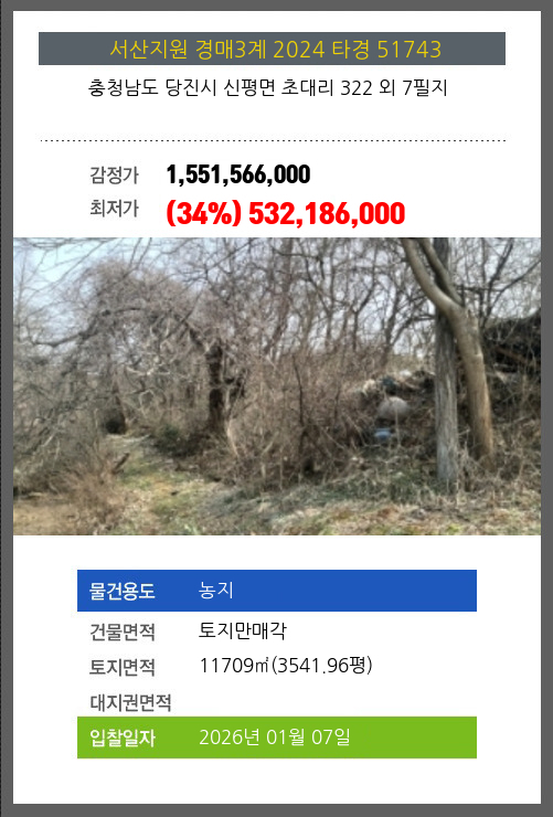 사건번호 2024 타경 51743 본건은 충청남도 당진시 신평면 초대리 322 외 7필지소재하는 농지경매 물건의 포스팅입니다. 건물면적 [ 토지만매각 ]토지면적 [ 11709㎡ (3541.96평) ] 시세를 반영한