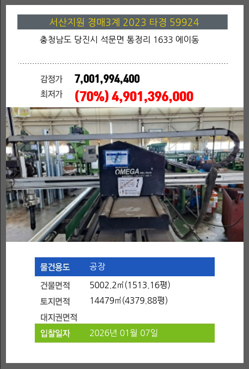 사건번호 2023 타경 59924 본건은 충청남도 당진시 석문면 통정리 1633 에이동소재하는 공장경매 물건의 포스팅입니다. 건물면적 [ 5002.2㎡ (1513.16평) ]토지면적 [ 14479㎡ (4379.88평) ] 시세를 반영한