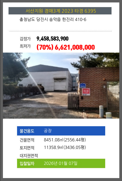 사건번호 2023 타경 6395 본건은 충청남도 당진시 송악읍 한진리 410-6소재하는 공장경매 물건의 포스팅입니다. 건물면적 [ 8451.08㎡ (2556.44평) ]토지면적 [ 11358.9㎡ (3436.05평) ] 시세를 반영한 감정가