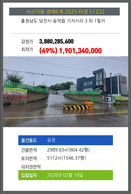 사건번호 2025 타경 51232 본건은 충청남도 당진시 송악읍 기지시리 3 외 1필지소재하는 공장경매 물건의 포스팅입니다. 건물면적 [ 2989.83㎡ (904.42평) ]토지면적 [ 5112㎡ (1546.37평) ] 시세를