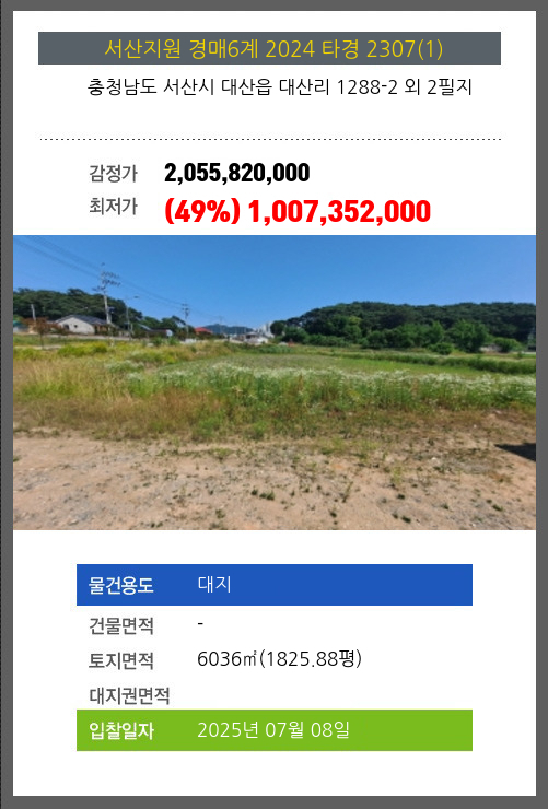 사건번호 2024 타경 2307(1) 본건은 충청남도 서산시 대산읍 대산리 1288-2 외 2필지소재하는 대지경매 물건의 포스팅입니다. 토지면적 [ 6036㎡ (1825.88평) ] 시세를 반영한 감정가 2,055,820,000에서2회 유찰되어