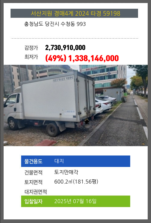 사건번호 2024 타경 59198 본건은 충청남도 당진시 수청동 993소재하는 대지경매 물건의 포스팅입니다. 건물면적 [ 토지만매각 ]토지면적 [ 600.2㎡ (181.56평) ] 시세를 반영한 감정가 2,730,910,000에서2회 유찰되어