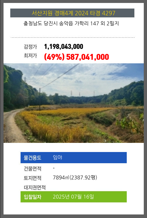 사건번호 2024 타경 4297 본건은 충청남도 당진시 송악읍 가학리 147 외 2필지소재하는 임야경매 물건의 포스팅입니다. 토지면적 [ 7894㎡ (2387.92평) ] 시세를 반영한 감정가 1,198,043,000에서2회 유찰되어