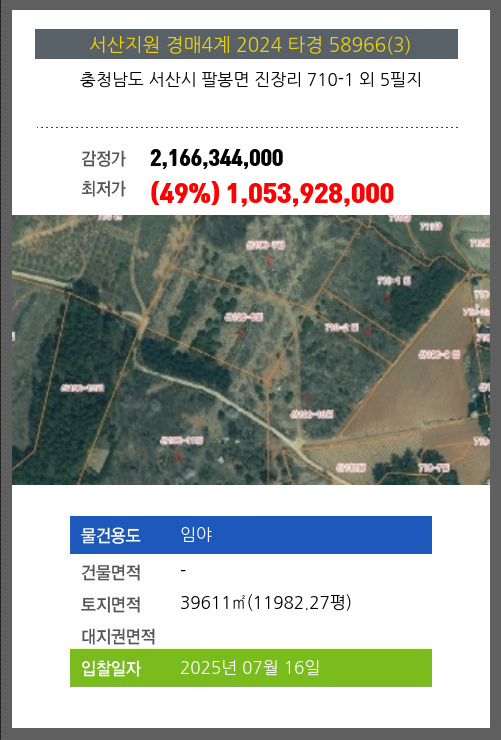 사건번호 2024 타경 58966(3) 본건은 충청남도 서산시 팔봉면 진장리 710-1 외 5필지소재하는 임야경매 물건의 포스팅입니다. 토지면적 [ 39611㎡ (11982.27평) ] 시세를 반영한 감정가 2,166,344,000에서2회 유찰되어