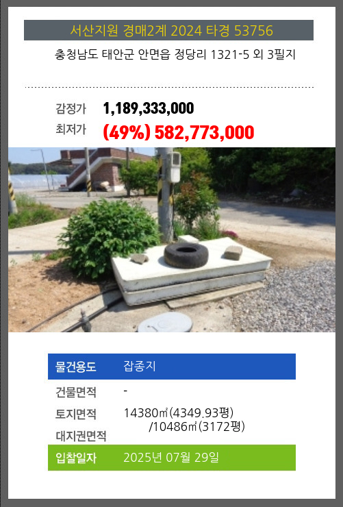 사건번호 2024 타경 53756 본건은 충청남도 태안군 안면읍 정당리 1321-5 외 3필지소재하는 잡종지경매 물건의 포스팅입니다. 토지면적 [ 전체:14380㎡ (4349.93평) 매각지분:10486㎡ (3172평) ] 시세를 반영한 감정가