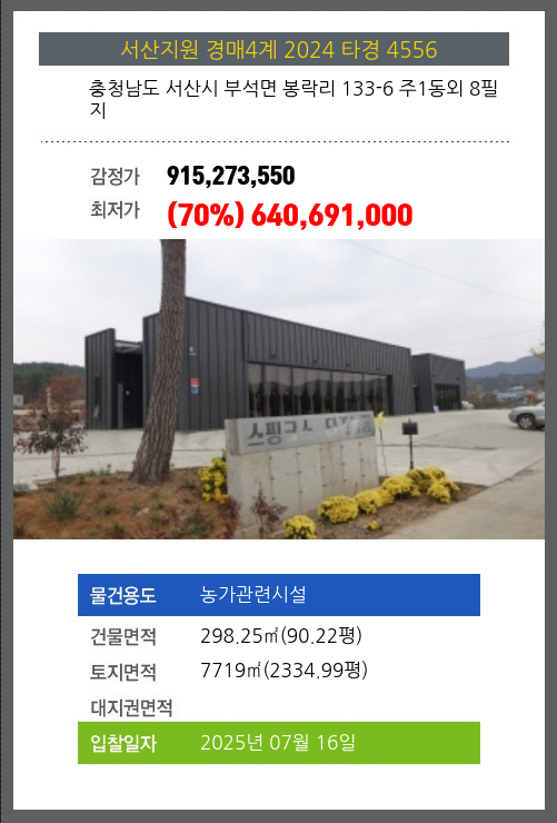 사건번호 2024 타경 4556 본건은 충청남도 서산시 부석면 봉락리 133-6 주1동외 8필지소재하는 농가관련시설경매 물건의 포스팅입니다. 건물면적 [ 298.25㎡ (90.22평) ]토지면적 [ 7719㎡ (2334.99평) ] 시세를