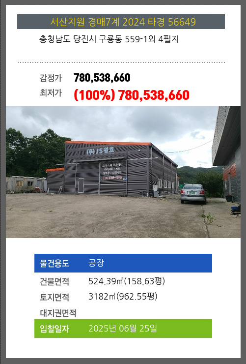 사건번호 2024 타경 56649 본건은 충청남도 당진시 구룡동 559-1외 4필지소재하는 공장경매 물건의 포스팅입니다. 건물면적 [ 524.39㎡ (158.63평) ]토지면적 [ 3182㎡ (962.55평) ] 시세를 반영한 감정가