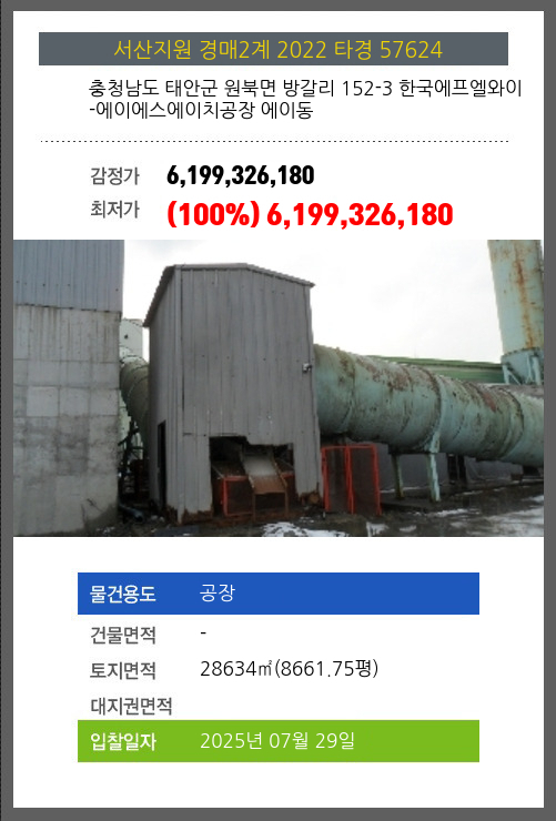사건번호 2022 타경 57624 본건은 충청남도 태안군 원북면 방갈리 152-3 한국에프엘와이-에이에스에이치공장 에이동소재하는 공장경매 물건의 포스팅입니다. 토지면적 [ 28634㎡ (8661.75평) ] 시세를 반영한 감정가 6,199,326,180에서신건으로 감정가