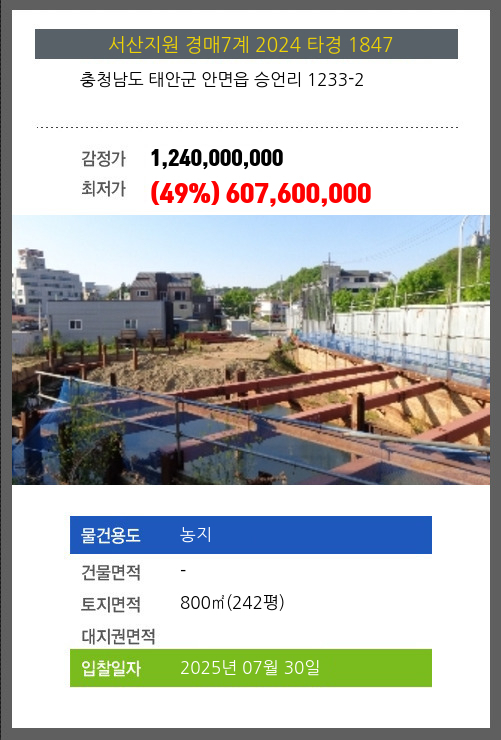 사건번호 2024 타경 1847 본건은 충청남도 태안군 안면읍 승언리 1233-2소재하는 농지경매 물건의 포스팅입니다. 토지면적 [ 800㎡ (242평) ] 시세를 반영한 감정가 1,240,000,000에서2회 유찰되어 감정가 대비