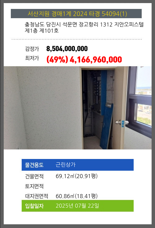 사건번호 2024 타경 54094(1) 본건은 충청남도 당진시 석문면 장고항리 1312 지안오피스텔 제1층 제101호소재하는 근린상가경매 물건의 포스팅입니다. 건물면적 [ 69.12㎡ (20.91평) ]대지권 [ 60.86㎡ (18.41평) ]