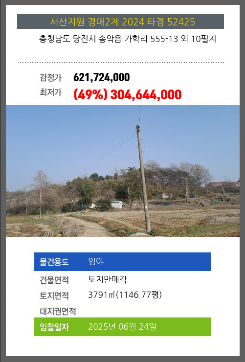 사건번호 2024 타경 52425 본건은 충청남도 당진시 송악읍 가학리 555-13 외 10필지소재하는 임야경매 물건의 포스팅입니다. 건물면적 [ 토지만매각 ]토지면적 [ 3791㎡ (1146.77평) ] 시세를 반영한