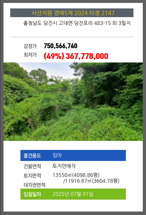 사건번호 2024 타경 2147 본건은 충청남도 당진시 고대면 당진포리 483-15 외 3필지소재하는 임야경매 물건의 포스팅입니다. 건물면적 [ 토지만매각 ]토지면적 [ 전체:13550㎡ (4098.86평) 매각지분:11916.67㎡ (3604.78평) ]
