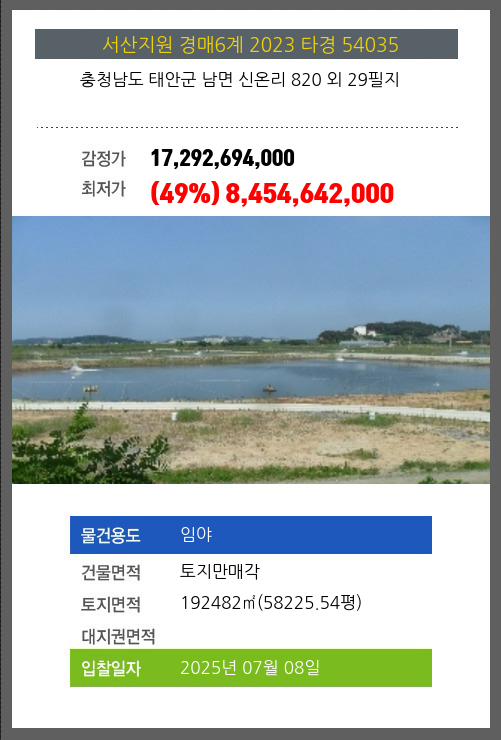 사건번호 2023 타경 54035 본건은 충청남도 태안군 남면 신온리 820 외 29필지소재하는 임야경매 물건의 포스팅입니다. 건물면적 [ 토지만매각 ]토지면적 [ 192482㎡ (58225.54평) ] 시세를 반영한