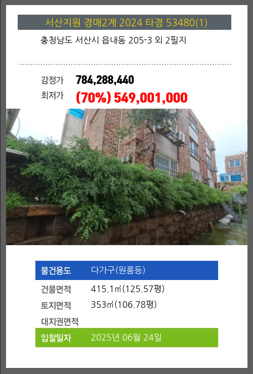 사건번호 2024 타경 53480(1) 본건은 충청남도 서산시 읍내동 205-3 외 2필지소재하는 다가구(원룸등)경매 물건의 포스팅입니다. 건물면적 [ 415.1㎡ (125.57평) ]토지면적 [ 353㎡ (106.78평) ] 시세를 반영한