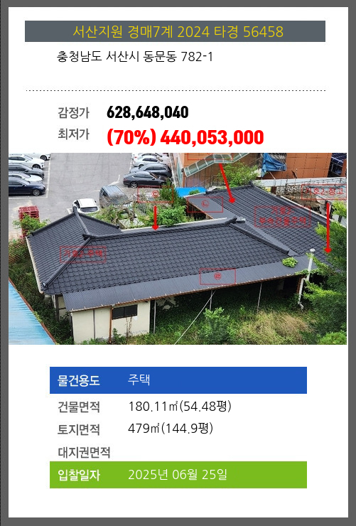 사건번호 2024 타경 56458 본건은 충청남도 서산시 동문동 782-1소재하는 주택경매 물건의 포스팅입니다. 건물면적 [ 180.11㎡ (54.48평) ]토지면적 [ 479㎡ (144.9평) ] 시세를 반영한 감정가 628,648,040에서1회