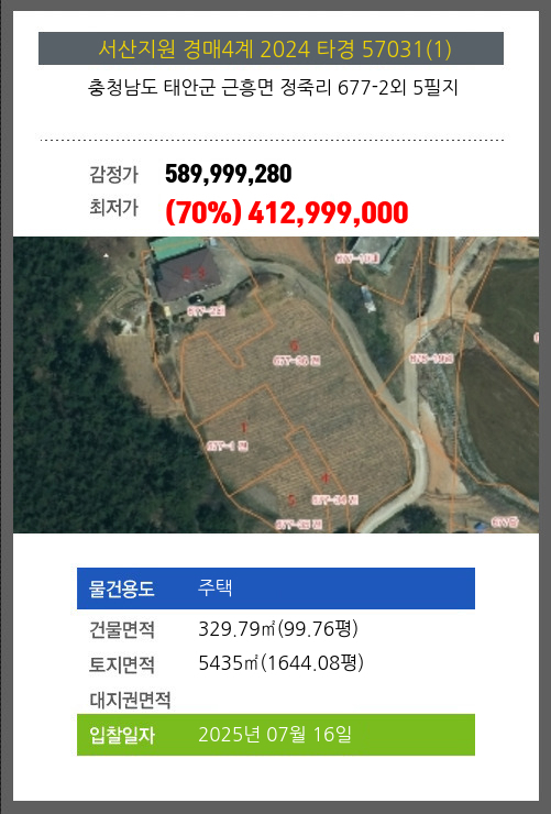 사건번호 2024 타경 57031(1) 본건은 충청남도 태안군 근흥면 정죽리 677-2외 5필지소재하는 주택경매 물건의 포스팅입니다. 건물면적 [ 329.79㎡ (99.76평) ]토지면적 [ 5435㎡ (1644.08평) ] 시세를 반영한
