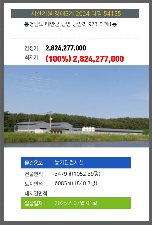 사건번호 2024 타경 54155 본건은 충청남도 태안군 남면 당암리 923-5 제1동소재하는 농가관련시설경매 물건의 포스팅입니다. 건물면적 [ 3479㎡ (1052.39평) ]토지면적 [ 6085㎡ (1840.7평) ] 시세를 반영한