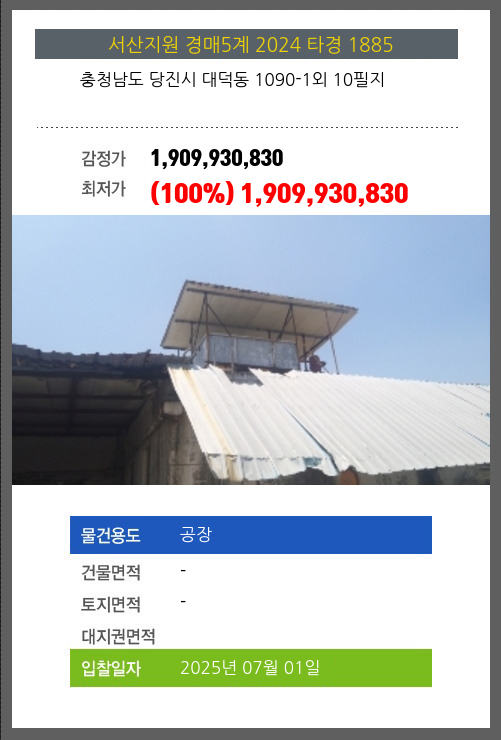 사건번호 2024 타경 1885 본건은 충청남도 당진시 대덕동 1090-1외 10필지소재하는 공장경매 물건의 포스팅입니다. 시세를 반영한 감정가 1,909,930,830에서신건으로 감정가 대비 100%최저가 1,909,930,830부터입찰에 참여할 수 있습니다. 입찰보증금은