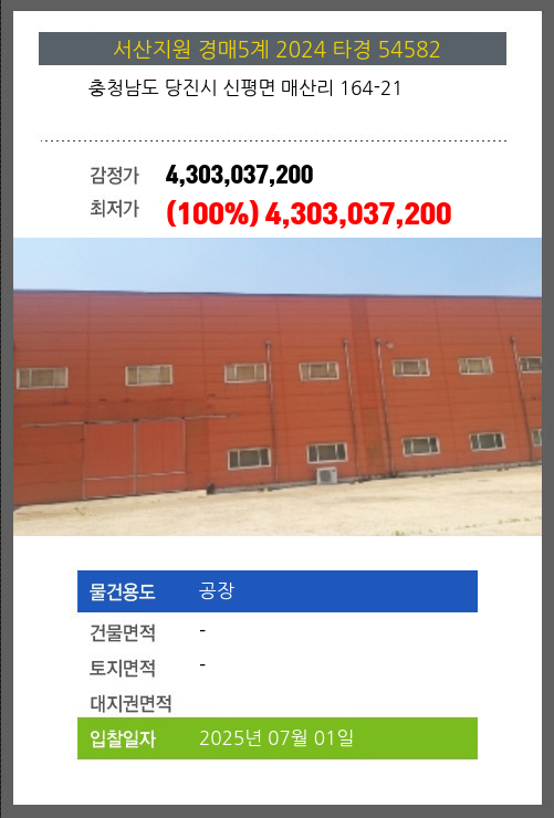 사건번호 2024 타경 54582 본건은 충청남도 당진시 신평면 매산리 164-21소재하는 공장경매 물건의 포스팅입니다. 시세를 반영한 감정가 4,303,037,200에서신건으로 감정가 대비 100%최저가 4,303,037,200부터입찰에 참여할 수 있습니다. 입찰보증금은