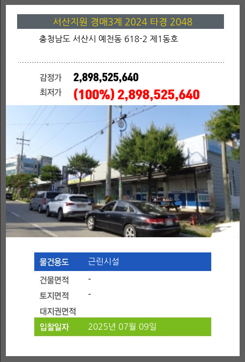 사건번호 2024 타경 2048 본건은 충청남도 서산시 예천동 618-2 제1동호소재하는 근린시설경매 물건의 포스팅입니다. 시세를 반영한 감정가 2,898,525,640에서신건으로 감정가 대비 100%최저가 2,898,525,640부터입찰에 참여할 수 있습니다. 입찰보증금은