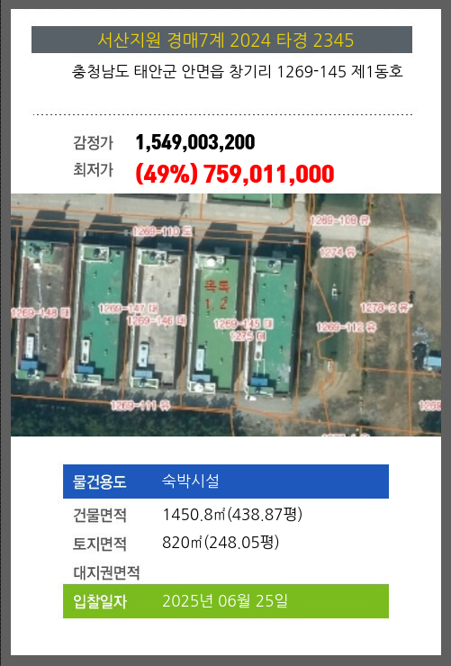 사건번호 2024 타경 2345 본건은 충청남도 태안군 안면읍 창기리 1269-145 제1동호소재하는 숙박시설경매 물건의 포스팅입니다. 건물면적 [ 1450.8㎡ (438.87평) ]토지면적 [ 820㎡ (248.05평) ] 시세를 반영한