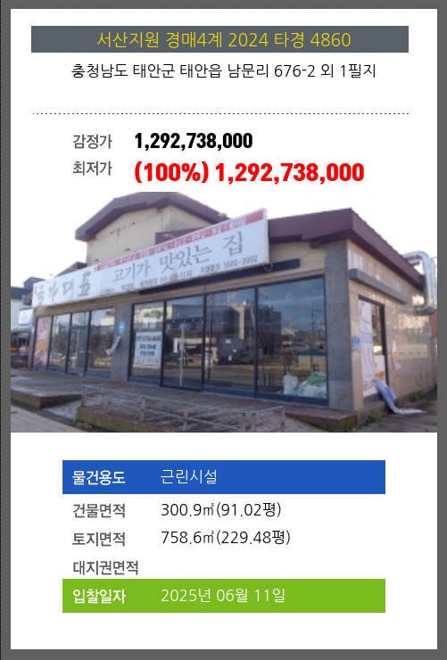 사건번호 2024 타경 4860 본건은 충청남도 태안군 태안읍 남문리 676-2 외 1필지소재하는 근린시설경매 물건의 포스팅입니다. 건물면적 [ 300.9㎡ (91.02평) ]토지면적 [ 758.6㎡ (229.48평) ] 시세를