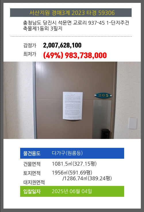 사건번호 2023 타경 59306 본건은 충청남도 당진시 석문면 교로리 937-45 1-단지주건축물제1동외 3필지소재하는 다가구(원룸등)경매 물건의 포스팅입니다. 건물면적 [ 1081.5㎡ (327.15평) ]토지면적 [ 전체:1956㎡ (591.69평) 매각지분:1286.74㎡ (389.24평)