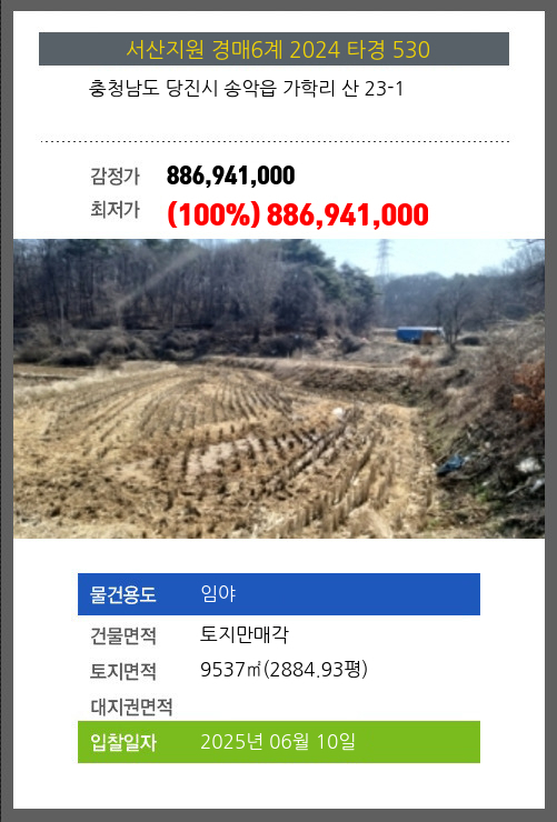 사건번호 2024 타경 530 본건은 충청남도 당진시 송악읍 가학리 산 23-1소재하는 임야경매 물건의 포스팅입니다. 건물면적 [ 토지만매각 ]토지면적 [ 9537㎡ (2884.93평) ] 시세를 반영한 감정가