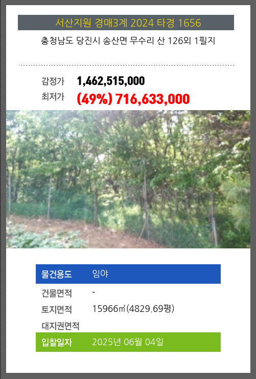 사건번호 2024 타경 1656 본건은 충청남도 당진시 송산면 무수리 산 126외 1필지소재하는 임야경매 물건의 포스팅입니다. 토지면적 [ 15966㎡ (4829.69평) ] 시세를 반영한 감정가 1,462,515,000에서2회 유찰되어