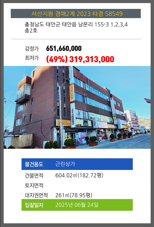 사건번호 2023 타경 58549 본건은 충청남도 태안군 태안읍 남문리 155-3 1,2,3,4층2호소재하는 근린상가경매 물건의 포스팅입니다. 건물면적 [ 604.02㎡ (182.72평) ]대지권 [ 261㎡ (78.95평) ] 시세를 반영한