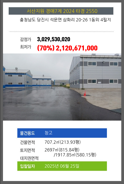 사건번호 2024 타경 2550 본건은 충청남도 당진시 석문면 삼화리 20-26 1동외 4필지소재하는 창고경매 물건의 포스팅입니다. 건물면적 [ 707.2㎡ (213.93평) ]토지면적 [ 전체:2697㎡ (815.84평) 매각지분:1917.85㎡ (580.15평)