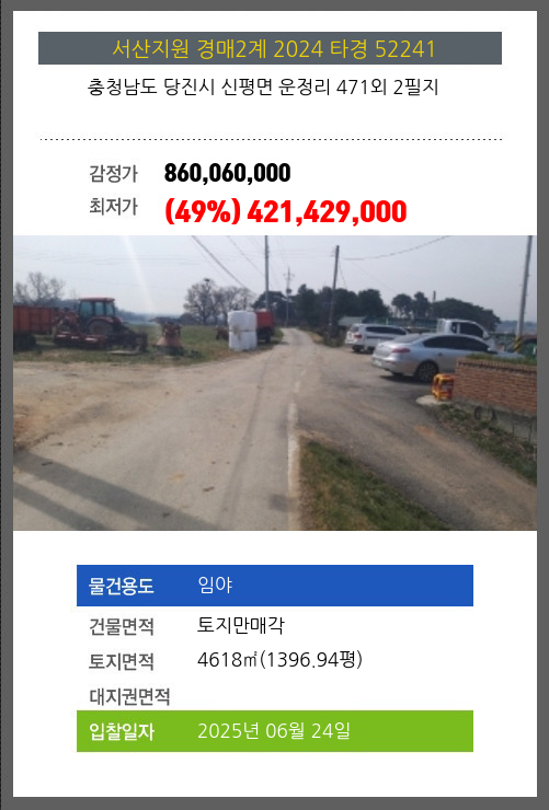 사건번호 2024 타경 52241 본건은 충청남도 당진시 신평면 운정리 471외 2필지소재하는 임야경매 물건의 포스팅입니다. 건물면적 [ 토지만매각 ]토지면적 [ 4618㎡ (1396.94평) ] 시세를 반영한 감정가