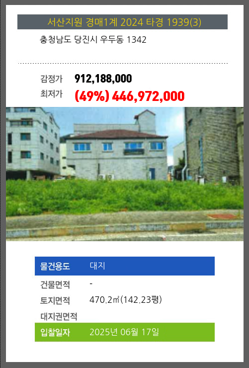 사건번호 2024 타경 1939(3) 본건은 충청남도 당진시 우두동 1342소재하는 대지경매 물건의 포스팅입니다. 토지면적 [ 470.2㎡ (142.23평) ] 시세를 반영한 감정가 912,188,000에서2회 유찰되어 감정가 대비 49%최저가