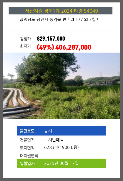 사건번호 2024 타경 54049 본건은 충청남도 당진시 송악읍 반촌리 177 외 7필지소재하는 농지경매 물건의 포스팅입니다. 건물면적 [ 토지만매각 ]토지면적 [ 6283㎡ (1900.6평) ] 시세를 반영한