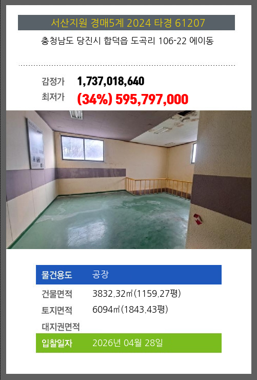 사건번호 2024 타경 61207 본건은 충청남도 당진시 합덕읍 도곡리 106-22 에이동소재하는 공장경매 물건의 포스팅입니다. 건물면적 [ 3832.32㎡ (1159.27평) ]토지면적 [ 6094㎡ (1843.43평) ] 시세를 반영한
