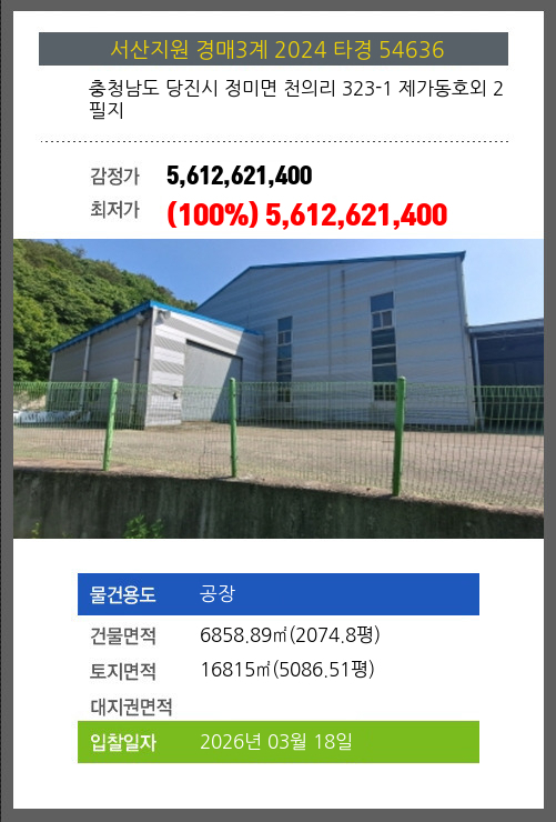 사건번호 2024 타경 54636 본건은 충청남도 당진시 정미면 천의리 323-1 제가동호외 2필지소재하는 공장경매 물건의 포스팅입니다. 건물면적 [ 6858.89㎡ (2074.8평) ]토지면적 [ 16815㎡ (5086.51평) ] 시세를