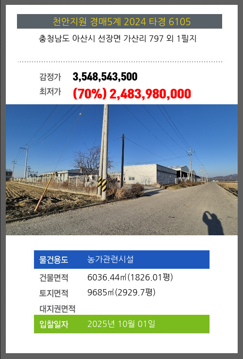 사건번호 2024 타경 6105 본건은 충청남도 아산시 선장면 가산리 797 외 1필지소재하는 농가관련시설경매 물건의 포스팅입니다. 건물면적 [ 6036.44㎡ (1826.01평) ]토지면적 [ 9685㎡ (2929.7평) ] 시세를