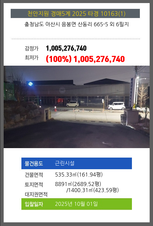 사건번호 2025 타경 10163(1) 본건은 충청남도 아산시 음봉면 산동리 665-5 외 6필지소재하는 근린시설경매 물건의 포스팅입니다. 건물면적 [ 535.33㎡ (161.94평) ]토지면적 [ 전체:8891㎡ (2689.52평) 매각지분:1400.31㎡ (423.59평)