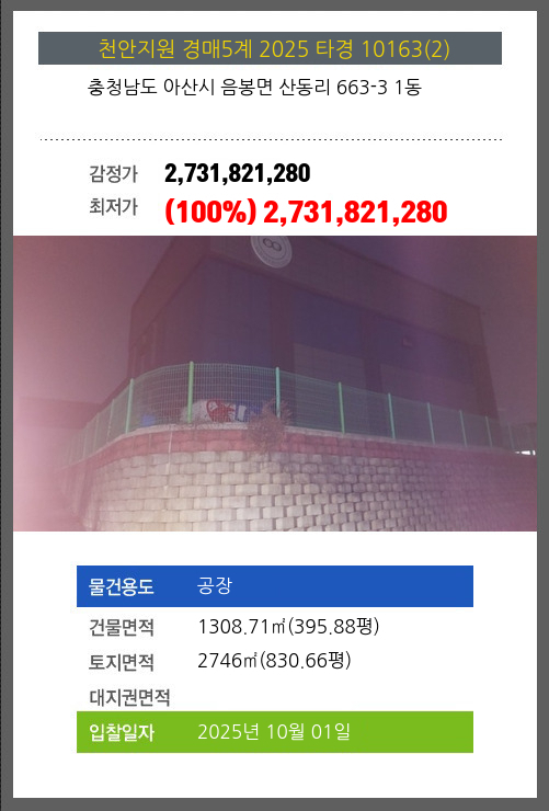 사건번호 2025 타경 10163(2) 본건은 충청남도 아산시 음봉면 산동리 663-3 1동소재하는 공장경매 물건의 포스팅입니다. 건물면적 [ 1308.71㎡ (395.88평) ]토지면적 [ 2746㎡ (830.66평) ] 시세를 반영한