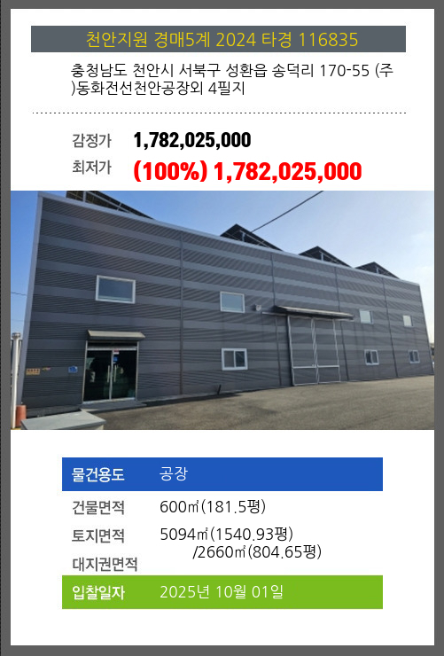 사건번호 2024 타경 116835 본건은 충청남도 천안시 서북구 성환읍 송덕리 170-55 (주)동화전선천안공장외 4필지소재하는 공장경매 물건의 포스팅입니다. 건물면적 [ 600㎡ (181.5평) ]토지면적 [ 전체:5094㎡ (1540.93평) 매각지분:2660㎡