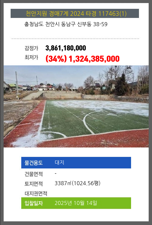 사건번호 2024 타경 117463(1) 본건은 충청남도 천안시 동남구 신부동 38-59소재하는 대지경매 물건의 포스팅입니다. 토지면적 [ 3387㎡ (1024.56평) ] 시세를 반영한 감정가 3,861,180,000에서3회 유찰되어 감정가 대비