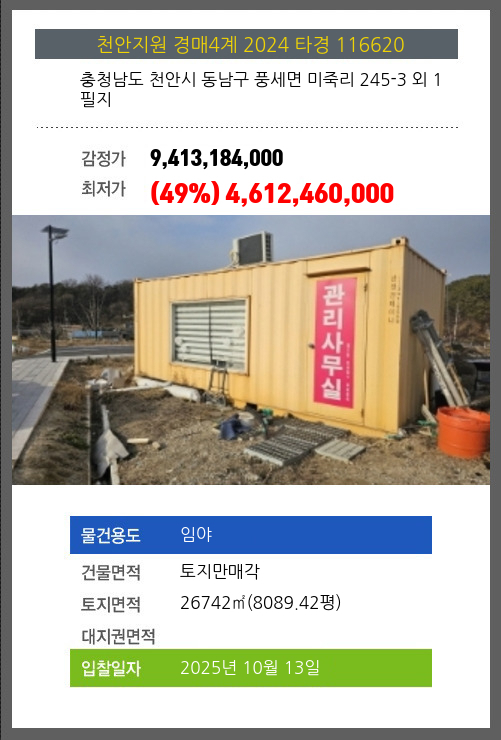 사건번호 2024 타경 116620 본건은 충청남도 천안시 동남구 풍세면 미죽리 245-3 외 1필지소재하는 임야경매 물건의 포스팅입니다. 건물면적 [ 토지만매각 ]토지면적 [ 26742㎡ (8089.42평) ] 시세를
