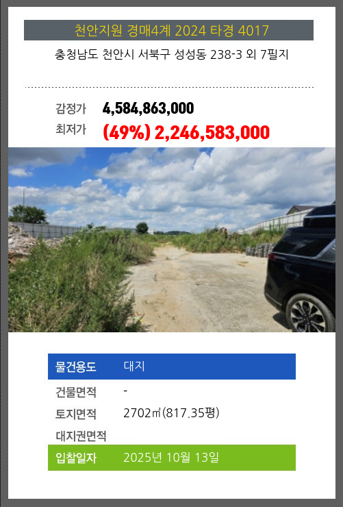 사건번호 2024 타경 4017 본건은 충청남도 천안시 서북구 성성동 238-3 외 7필지소재하는 대지경매 물건의 포스팅입니다. 토지면적 [ 2702㎡ (817.35평) ] 시세를 반영한 감정가 4,584,863,000에서2회 유찰되어