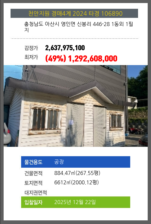 사건번호 2024 타경 106890 본건은 충청남도 아산시 영인면 신봉리 446-28 1동외 1필지소재하는 공장경매 물건의 포스팅입니다. 건물면적 [ 884.47㎡ (267.55평) ]토지면적 [ 6612㎡ (2000.12평) ] 시세를