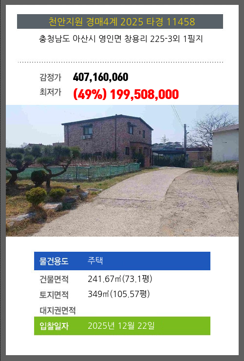 사건번호 2025 타경 11458 본건은 충청남도 아산시 영인면 창용리 225-3외 1필지소재하는 주택경매 물건의 포스팅입니다. 건물면적 [ 241.67㎡ (73.1평) ]토지면적 [ 349㎡ (105.57평) ] 시세를 반영한