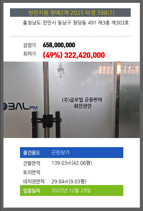사건번호 2025 타경 398(1) 본건은 충청남도 천안시 동남구 청당동 491 제3층 제303호소재하는 근린상가경매 물건의 포스팅입니다. 건물면적 [ 139.03㎡ (42.06평) ]대지권 [ 29.84㎡ (9.03평) ] 시세를