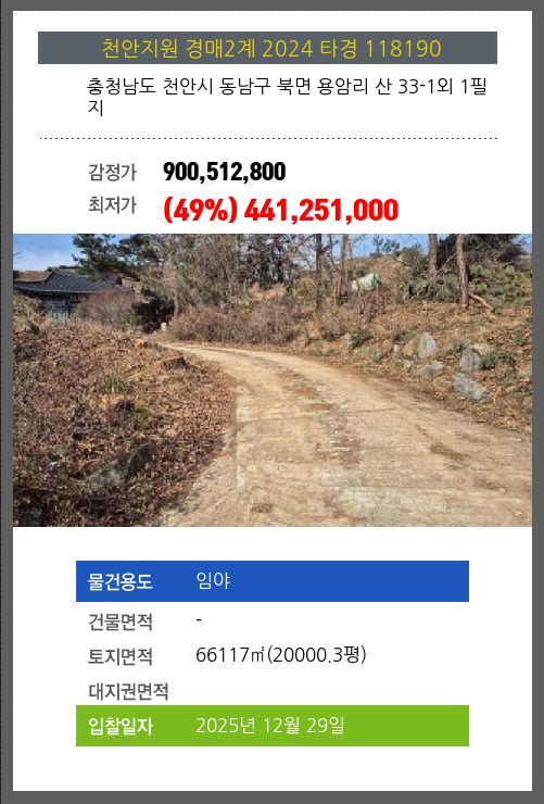 사건번호 2024 타경 118190 본건은 충청남도 천안시 동남구 북면 용암리 산 33-1외 1필지소재하는 임야경매 물건의 포스팅입니다. 토지면적 [ 66117㎡ (20000.3평) ] 시세를 반영한 감정가 900,512,800에서2회