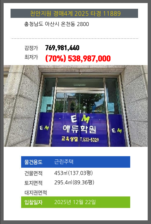 사건번호 2025 타경 11889 본건은 충청남도 아산시 온천동 2800소재하는 근린주택경매 물건의 포스팅입니다. 건물면적 [ 453㎡ (137.03평) ]토지면적 [ 295.4㎡ (89.36평) ] 시세를 반영한 감정가 769,981,440에서1회