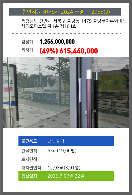 사건번호 2024 타경 112055(3) 본건은 충청남도 천안시 서북구 불당동 1479 불당코아루와이드시티오피스텔 제1층 제104호소재하는 근린상가경매 물건의 포스팅입니다. 건물면적 [ 63㎡ (19.06평) ]대지권 [ 12.93㎡ (3.91평) ]