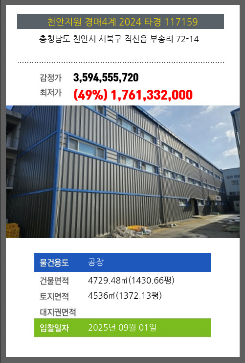 사건번호 2024 타경 117159 본건은 충청남도 천안시 서북구 직산읍 부송리 72-14소재하는 공장경매 물건의 포스팅입니다. 건물면적 [ 4729.48㎡ (1430.66평) ]토지면적 [ 4536㎡ (1372.13평) ] 시세를 반영한